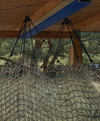Um solche vermeidbaren Gefahren auszuschließen, empfehlen wir, Großballenheunetze zu verwenden und diese mit einem Strick oben fest zusammenzuziehen und sehr stramm nach oben abzuspannen. So gibt es keine Lücken, und das Heunetz bleibt stramm genug, damit es weder aus der Raufe gezogen werden kann, noch sich ein Pferdekopf unter dem Heunetz verfängt.