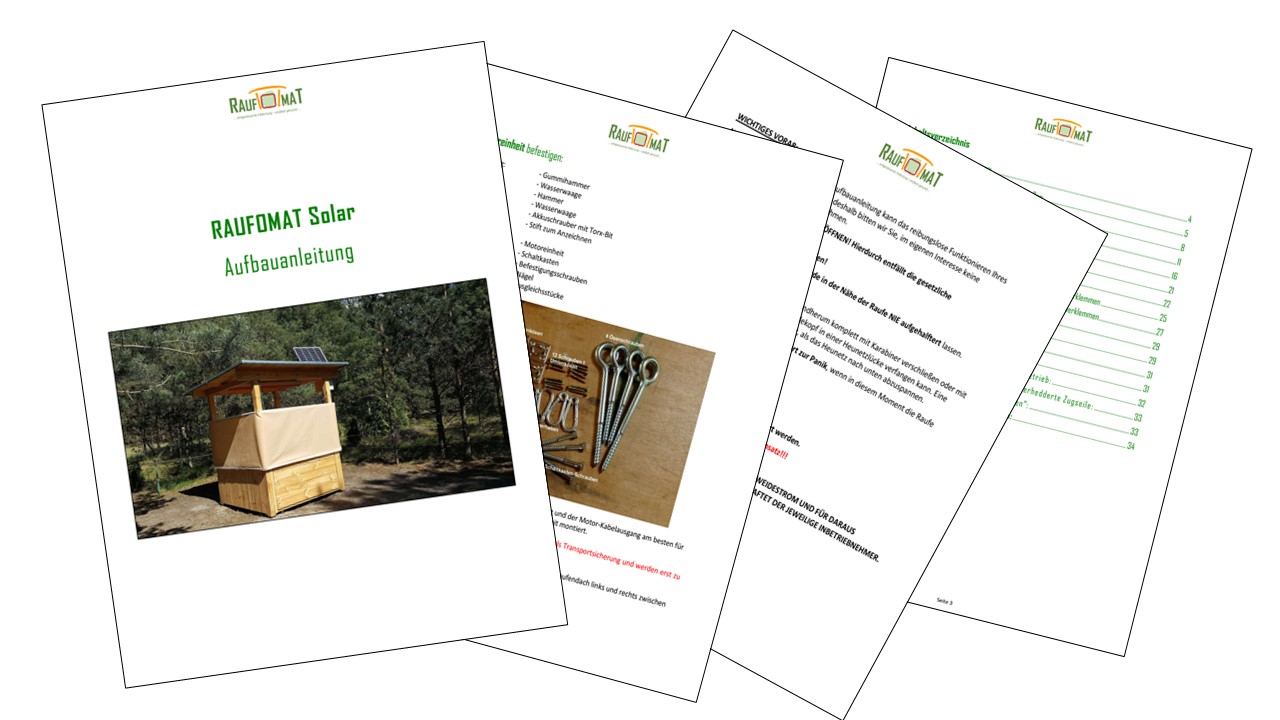 Die für jeden Kunden individuell angepasste Aufbauanleitung für den gemäß der Kundenspezifikationen maßangefertigten Raufomat-Bausatz wird am Auslieferungstag per E-Mail verschickt.