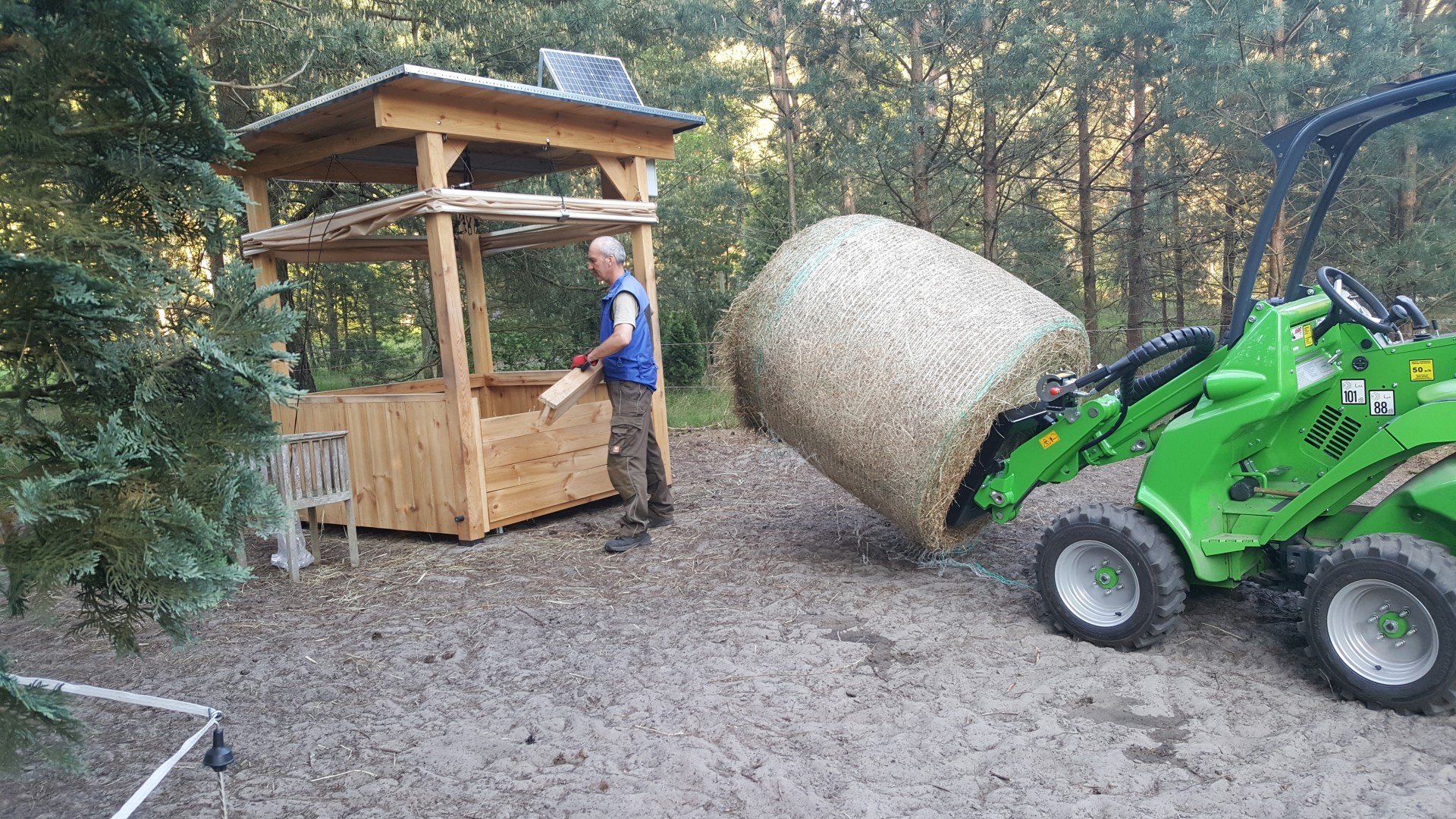 Sofern die "raufomatisierte" Holzraufe stabil genug ist, kann die komplette Raufe inklusive Solarmodul und Raufenrock auch einmal einige Meter versetzt werden, ohne irgendetwas abbauen zu müssen. Dies haben wir selbst mit einer unserer "raufomatisierten" Holzraufen gemacht. Regelmäßig ist ein solcher Umzug im Hinblick auf die Holzkonstruktion sicherlich nicht ratsam.