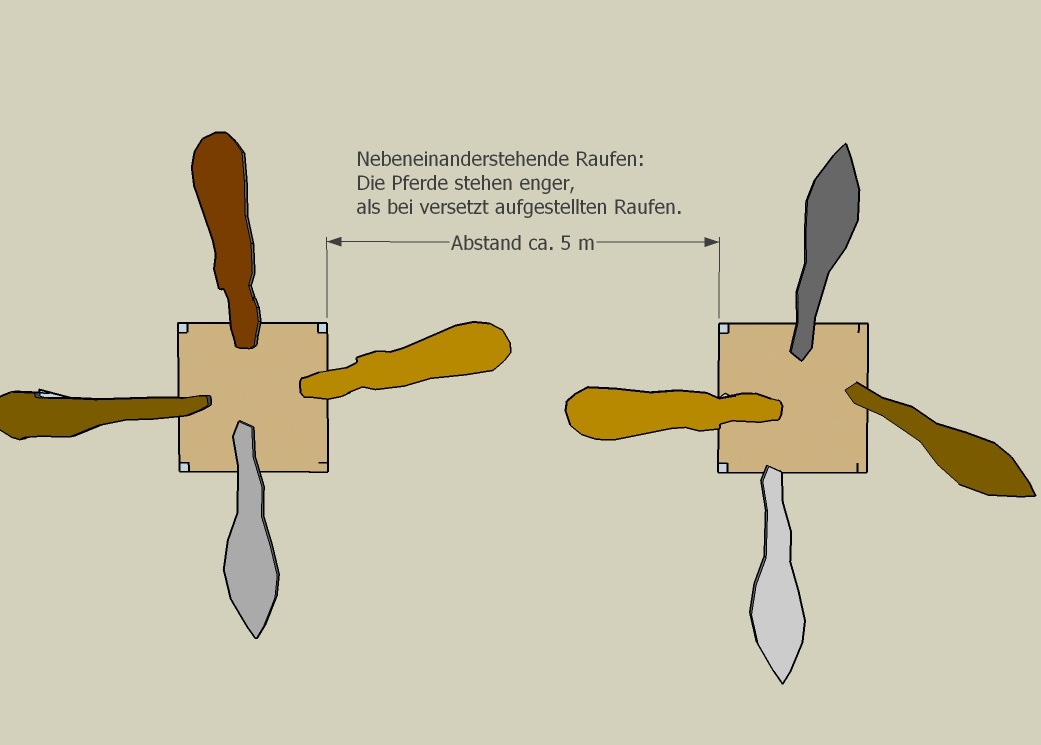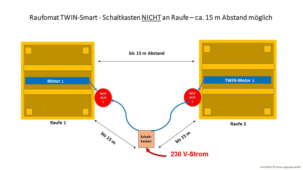 Zwei "raufomatisierte" Raufen, werden von 1 Raufomat-Smart-Steuerung synchron betrieben. Der Raufomat OHNE Steuerung kann jederzeit ausgeschaltet werden, während der Raufomat MIT Steuerung weiter im Einsatz ist.